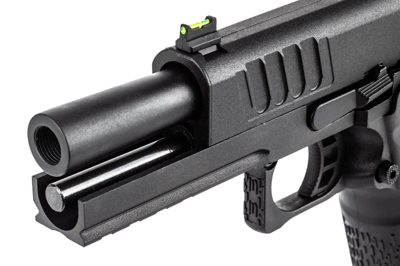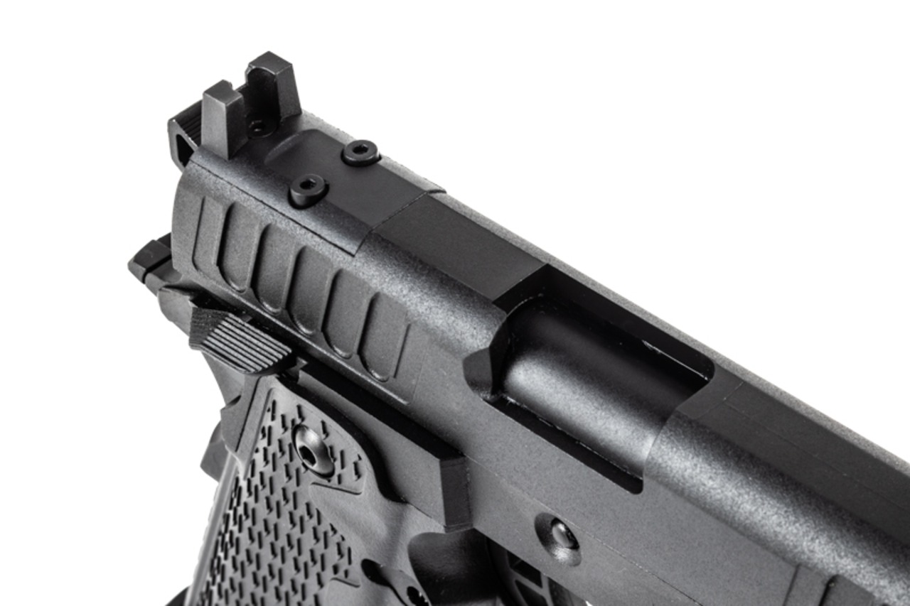 USMS SOG ( US マーシャル特殊作戦グループ )に採用された STACCATO-P DUO をモデルアップ。ダットサイトスライド直付け可能、アウターバレルは11mm 正ネジ(凹)(ショートリコイルキャンセル)でトレーサー対応、集光フロントサイト標準装備。STACCATO NTL CO2GBBは、セミロングマガジン 2011 CO2 マガジン Type-NTLを標準装備。