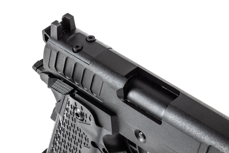 ・経済産業省認可の製造組合『 JASG 日本エアースポーツガン振興協同組合 』認定CO2ガス銃で改正銃刀法で定める0.98ジュール以下に適合する、製品安全検査に合格した製品。樹脂スライド。